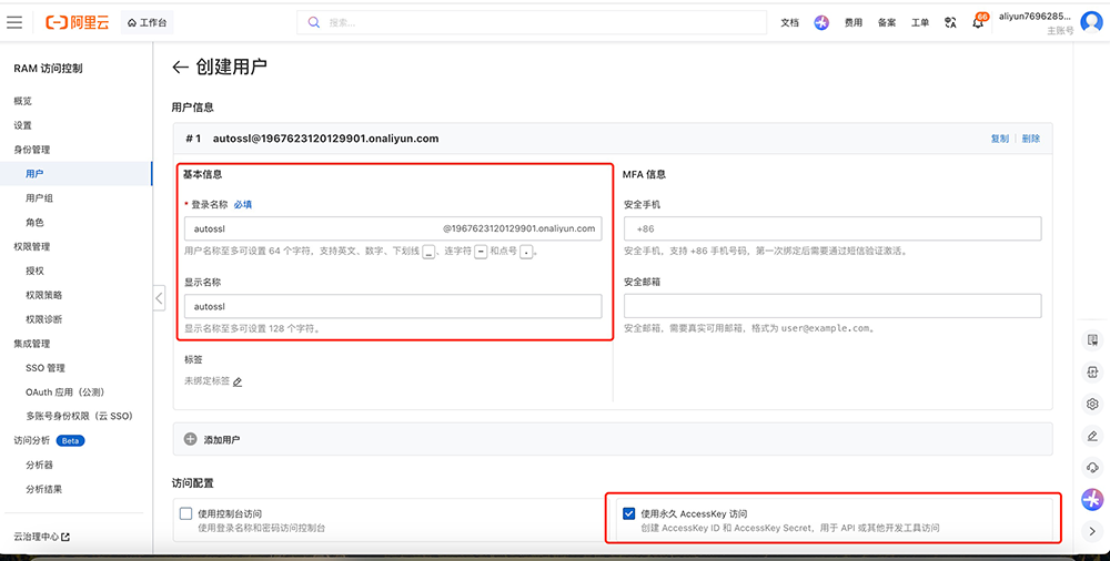 创建名称并且勾选使用永久AccessKey 访问