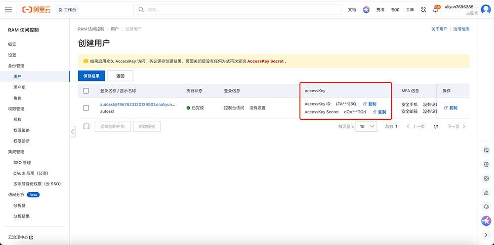 (二)复制AccessKey ID和AccessKey Secret并且及时保存,后续需要在系统中进行添加。