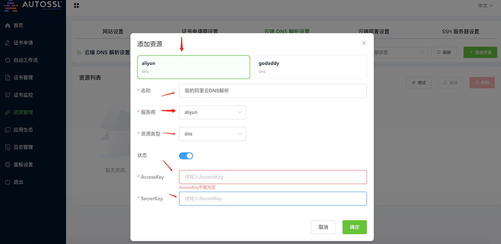 打开平台--资源管理---云端 DNS 解析设置