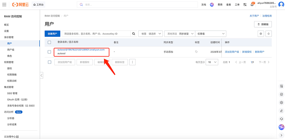 点击链接打开 RAM 访问控制--用户