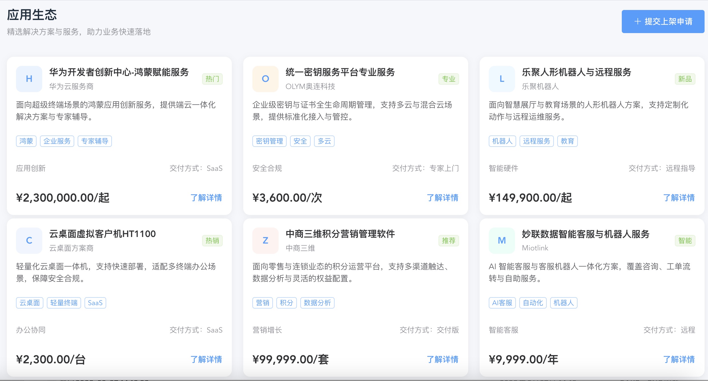 - 应用类型不限,包括但不限于安全防护,AI生态,应用工具,监控分析,运维管理,域名主机,营销推广,公司/商标,跨境出海等;